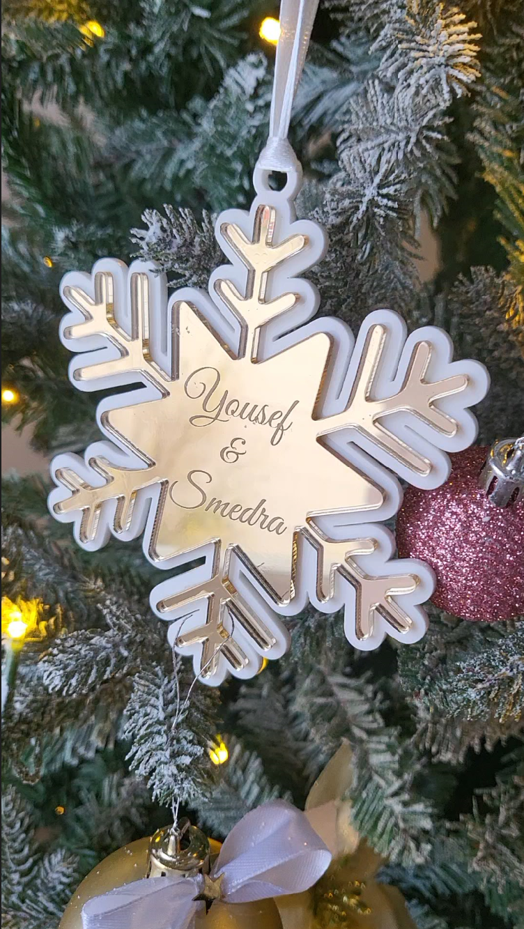 En vacker snöflinga i två lager akrylplast med parets namn graverat, perfekt att hänga i julgranen. En personlig och stilfull dekoration för en magisk julstämning.